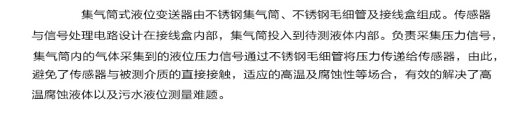聯(lián)測(cè)儀表SIN-P260G殼體高溫型集氣筒式液位計(jì)用于測(cè)量較高溫度液體介質(zhì)的液位,原理是被測(cè)液體介質(zhì)壓縮集氣桶內(nèi)的空氣,空氣壓力通過毛細(xì)管傳遞給敏感元件,敏感元件本身不與被測(cè)介質(zhì)直接接觸,因此變送器可以應(yīng)用在較高溫度的介質(zhì)環(huán)境中,同時(shí),內(nèi)置微型信號(hào)放大處理電路,可以直接與計(jì)算機(jī)接口卡、控制儀表、智能儀表或 PLC 等連接,進(jìn)行遠(yuǎn)程傳輸。液位變送器廣泛應(yīng)用于環(huán)保、水利、供水、工業(yè)過程控制、變頻供水等較高溫度介質(zhì)的液位測(cè)量。